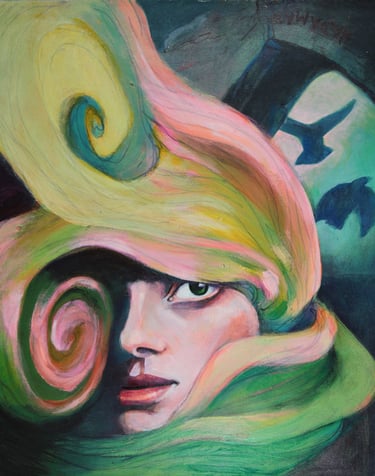 Just as the birds take flight, the swirling hair in "Mind, the Temple of Mystery" serves as a visual representation of the dynamic and unpredictable flow of life. It speaks to the creative forces at work around us. If we can accept the inherent mysteries in life, we open ourselves up to creativity and intuition. The energy of wonder reminds us that reality is not just black and white; it's a vibrant spectrum of experiences waiting to be explored. When we cultivate wonder, it can gently release our fear-based beliefs, leading to a more profound engagement with our existence and the universe.