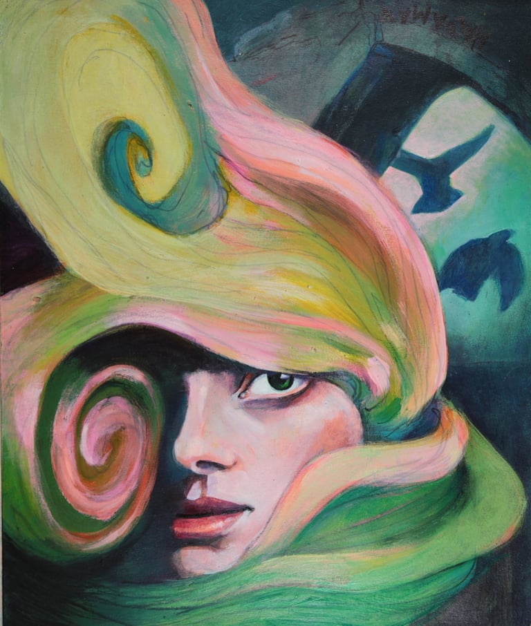In our daily lives, we often find ourselves entrapped by conditioned fears that limit our experience of the universe. In 'Mind, the Temple of Mystery', the intricate dance of birds in flight symbolizes the release of these fears, while the swirling movements of her hair embody the spiritual energies of mystery and wonder. Let’s explore how these elements in the artwork inspire us to break free from our self-imposed limitations.